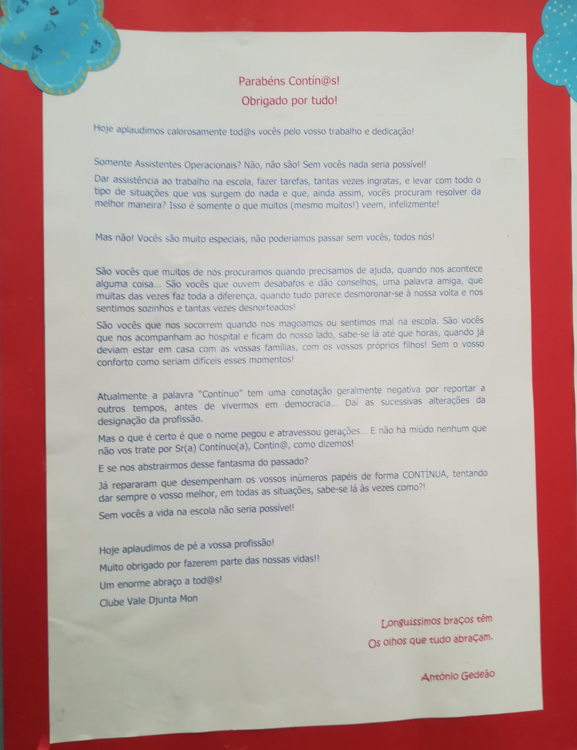 Na passada semana o Clube Vale Djunta Mon quis surpreender os assistentes operacionais da escola sede, oferecendo-lhes uma pequena lembrança em jeito de reconhecimento pela sua profissão.