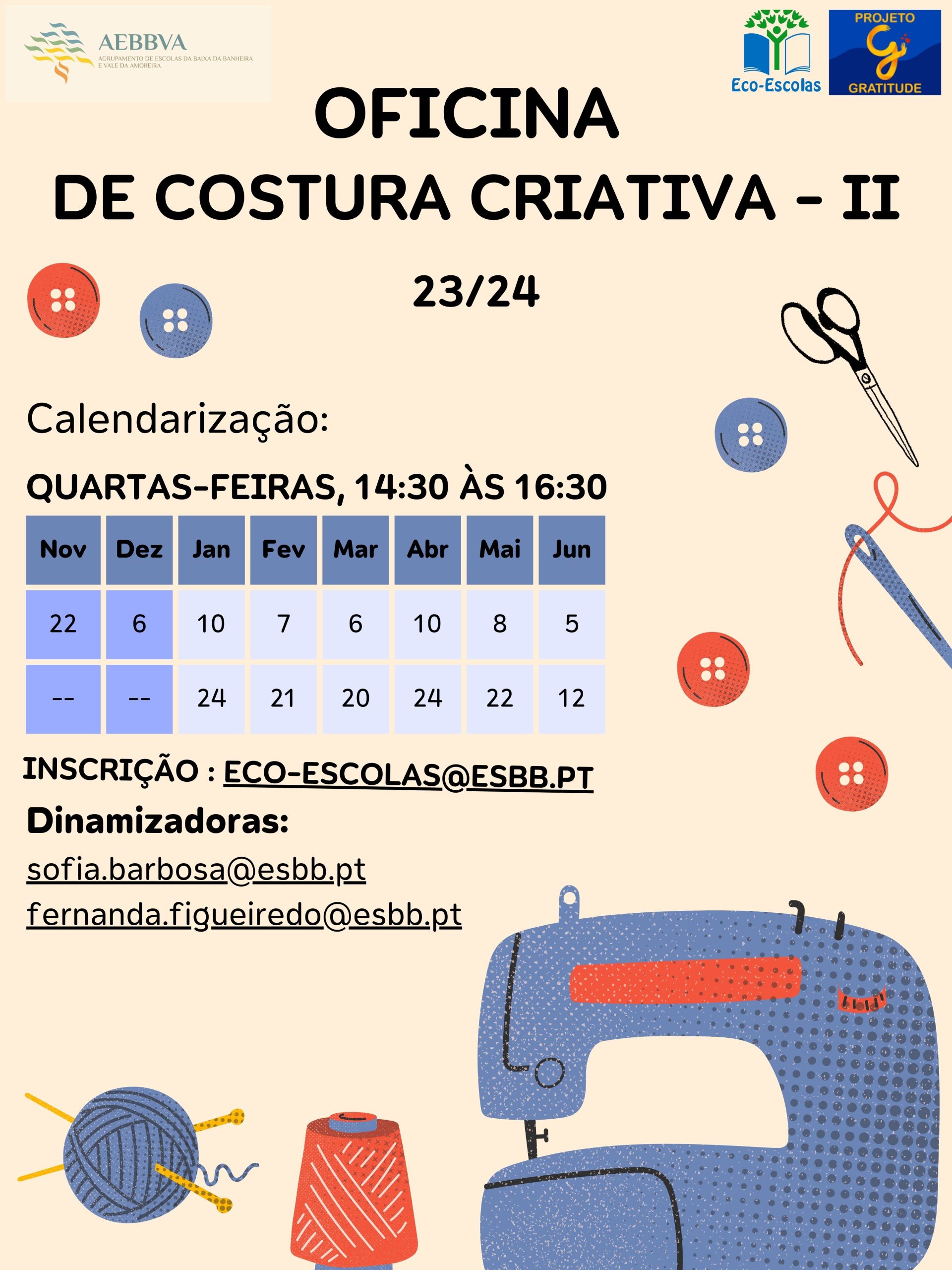 A OFICINA DE COSTURA CRIATIVA (2ª edição) vai ter início no próximo dia 22 de novembro (4ªf), das 14:30 às 16:30.